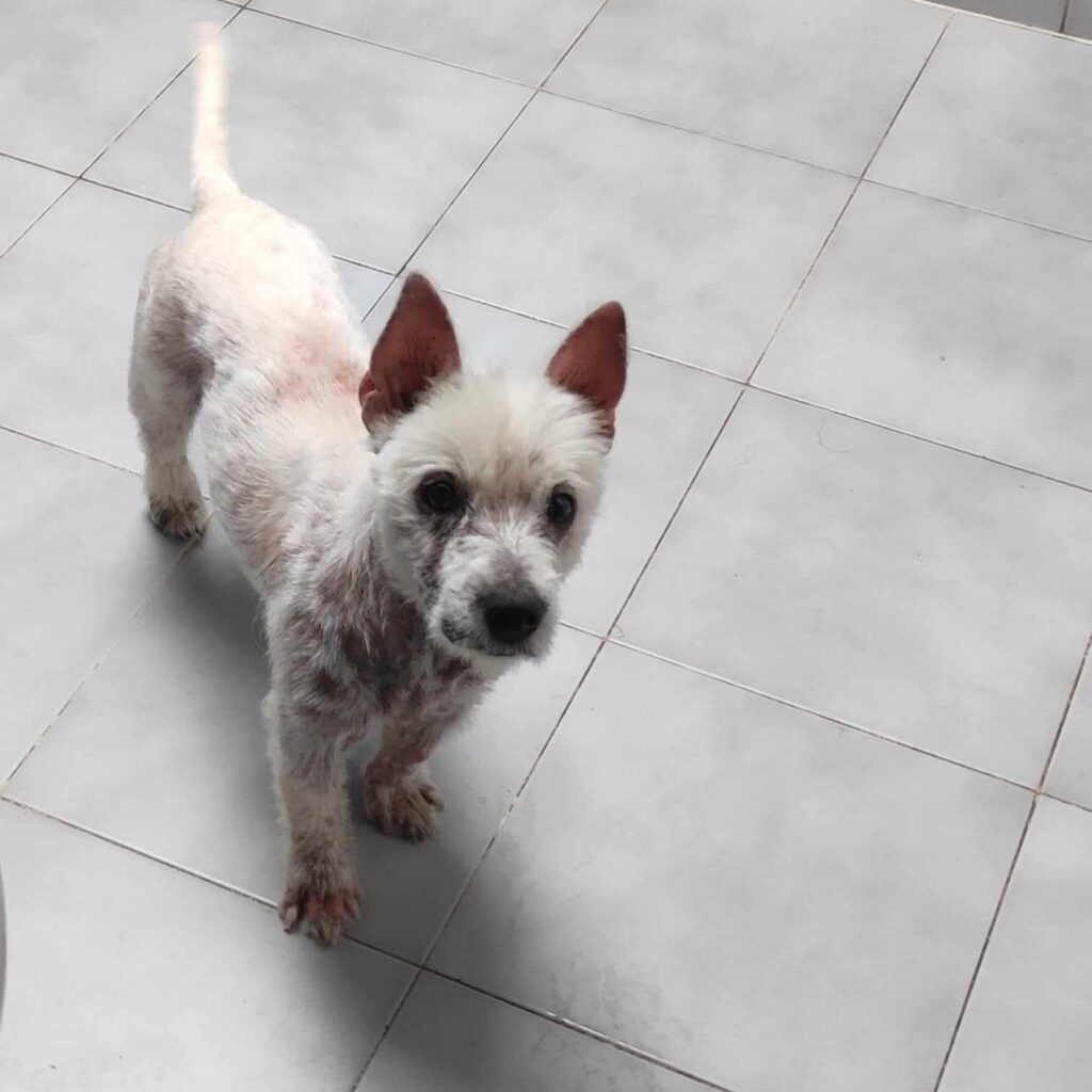 Berkenye, Bp környéki településen talált fiatal kislány. Chip természetesen nem volt benne, úgy gondoljuk hogy egy szaporító vált meg tőle. Egyrészt látszik, hogy jó néhányszor szült, másrészt szörnyen elhanyagolt állapota szintén erre utal. Fogazata alapján 4 év körüli, szívféreg tesztje negatív. Bőre borzasztóan csúnya, ezért allergia gyanú szerint kezdtük el a kezelését. Ennek megfelelő tápot, gyógyszert és sampont használunk. Meglepő módon a fülei egészen szép állapotban vannak. Ideiglenes befogadónál helyeztük el, ahol napok alatt feloldódott, kedves, keresi a többi kutya társaságát és játszik is velük. Amint sikerül kicsit felturbózni az általános állapotát, sort kerítünk majd az ivartalanítására.