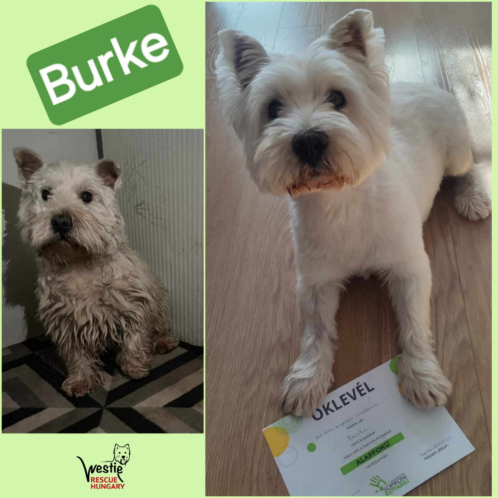 Most pedig itt a hír, amire a gazdik is és mi is nagyon büszkék vagyunk ! Burke nagyon menő kutya lett, elvégezte az alapfokú kutyatanfolyamot és itt nincs megállás…![]()