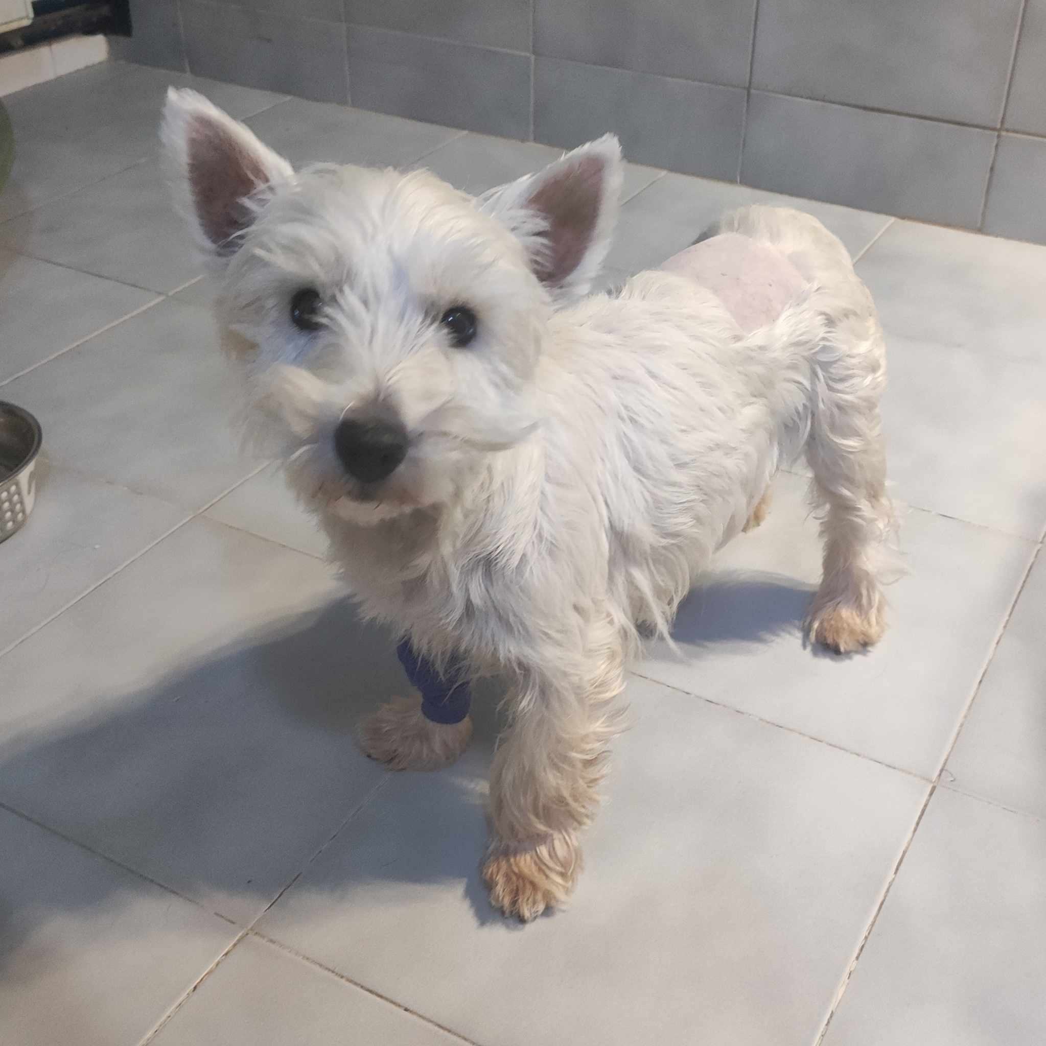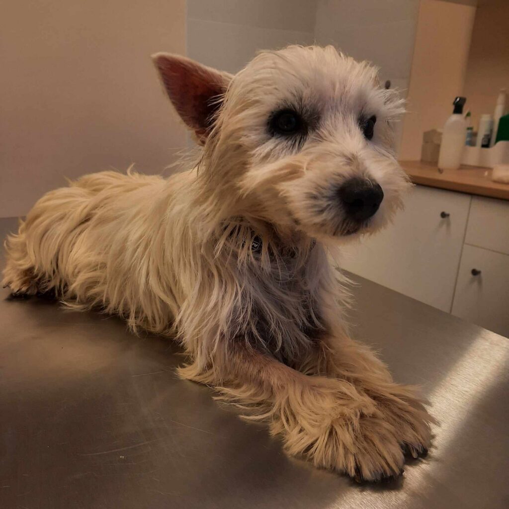 Évit 2 társával utcán fogta be a helyi állatmenhely, tőlük került a gondozásunkba. 3 év körüli ivaros kislány, bőre nagyobb területen szőrhiányos és gyulladt. A hasi UH nem mutatott problémákat, nem vemhes, de tüdő tájékon nem teljesen tiszta, erre célzott kezelést indítunk. Szívféreg tesztje sajnos
