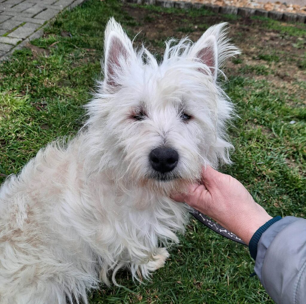 TDN gyorsan megvizsgálta, nem lapul-e meglepetés a pocakjában. Szerencsére az UH semmi aggasztót nem mutatott, ivaros, szívféreg negatív, fogai szépek. Kapott egy alapos kozmetikázást, amit békésen viselt. Ideiglenes befogadóinál még nehezen találja a helyét, de nem is vártunk mást, hiszen egy érzékszerve hiányzik. Vágyik a szeretetre, szinte azonnal próbált bújni.