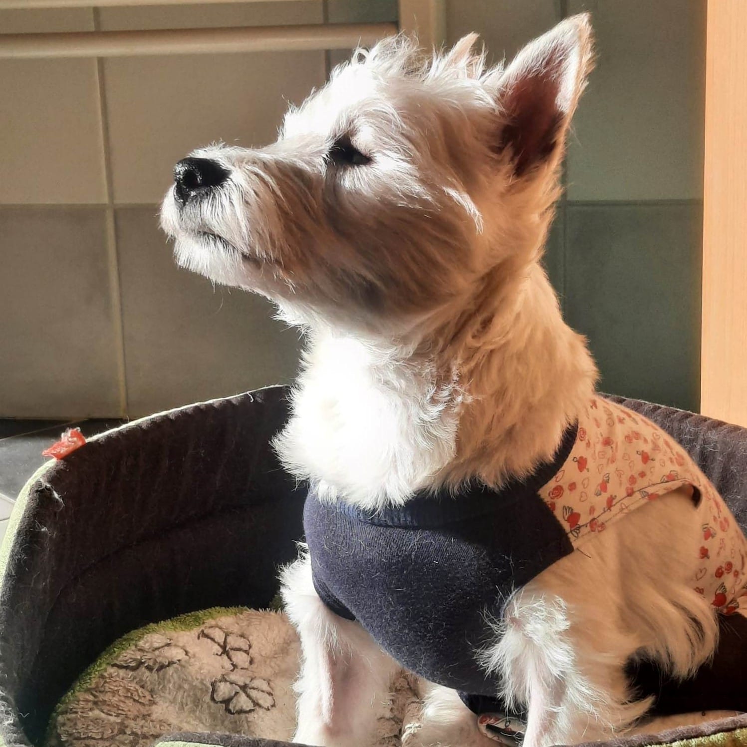 Kelly félénken, bizonytalanul, sokszor menekülve vagy éppen lemeredve töltötte első napjait. Nem csodálkoztunk, hiszen a külvilágból semmit nem lát. Viszont ilyen gyorsan még nem sok kutya váltott át abba az állapotba, hogy égnek álló lábakkal aludjon mellettünk. Érzi, hogy szeretjük. A kozmetikázást is teljes együttműködéssel viselte. Múlt héten meglátogattuk Judit doktornénit, aki alaposan megvizsgálta a szemeit. A szemultrahangon látszott, hogy mindkét szemgolyója csak csökevényes, valószínűleg veleszületett probléma, soha nem látott. Ezen kívül hályog is van az egyiken és irritáció miatt fokozott váladékozás. Ezekre a szemüreg kitisztítása és végleges zárása lesz majd a későbbiekben a megnyugtató megoldás. Ennél viszont sokkal fontosabb volt a mielőbbi ivartalanítása. A műtét gyorsan és probléma nélkül zajlott. Meglepően jól ébredt, se szédelgés, se remegés, se bepisilés. Az éjszaka viszont nehezen telt, folyamatos nyüszizéssel jelezte, hogy nem érzi jól magát. Nagyon figyelünk most rá, mert a tölcsér a szokottnál is jobban megrettenti, hiszen Ő ezt sem látja, nem érti mi került most rá. Reméljük a pihenéstől pár nap alatt elfelejthetjük a kellemetlenségeket.