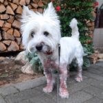 4 éves, törzskönyves kislány, akinek volt gazdái nem tudták már kezelni a képen látható helyzetet. Anyagi nehézségek miatt kérték segítségünket, mi pedig kis türelmüket kérve, természetesen vállaltuk Pandát. Sok allergiás kutyust láttunk már, de még mindig megdöbbenünk egy ilyen állapotú állat láttán. Panda egész testén gyulladásban van a bőr, de lábai vannak a legrosszabb állapotban. A tölcsért még rövid időre sem lehet nélkülözni, mert azonnal véresre rágja magát. Olyan intenzitással dörzsöli az arcát a fűben, hogy kiserken a vére. Elképzelni is szörnyű mennyire elviselhetetlen lehetett számára ez a viszketés. Érkezése után azonnal lenyírtuk a bundáját, hosszú áztatós fürdés következett, elképesztő mennyiségű trutyit távolítottunk el róla. Most abban bízunk, hogy a speciális samponok, gyógyszerek és táplálás remélhetőleg hamarosan csökkenteni fogják a tüneteit és elindul a gyógyulás útján. Kivizsgálása elkezdődött, az eredményekről folyamatosan beszámolunk majd. Egészen biztos, hogy hosszú és költséges nálunk tartózkodásra kell berendezkednünk Vele, amihez mindennemű támogatásra nagy szükségünk van.
