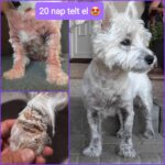 Mire elég 20 nap? Nem túl hosszú idő, mégis hatalmas változások történhetnek. A képre nézve szinte ordít, hogy egy addig kínok között élt állatnak, micsoda különbséget jelent ez az életminőségben. Panda csak visszahúzódva feküdt tölcsérrel a fején és szinte őrült módjára rágta szét lábait, ha lekerült a búra. TDN vizsgálatai után speciális táp etetése kezdődött és az ilyenkor már oly sokszor bizonyított Apoquel gyógyszer, napokon belül csökkentette a viszketést. Kétnaponta, hosszú fürdetések során, hihetetlen mértékben ázott le róla a sok-sok elhalt bőr, marékszám hullott a szőre. Közben megérkezett a laborvizsgálat eredménye is, ami minimális gyulladás mutatott és a pajzsmirigy hormonok is rendben vannak. Szinte napról-napra érzékelhető volt a változás, ami már a kedvében is érzékelhető. Milyen most Panda? Jelentősen mérséklődött a szaga, alig vakaródzik, megállt a szőrhullás. Na és a kedve…játszik, sőt bohóckodik, dumál-morog. Bújik, túrja magát az emberhez, együttműködő. Remek példája annak, hogy a megfelelő segítséggel milyen gyorsan elindulhatunk a csoda útján.