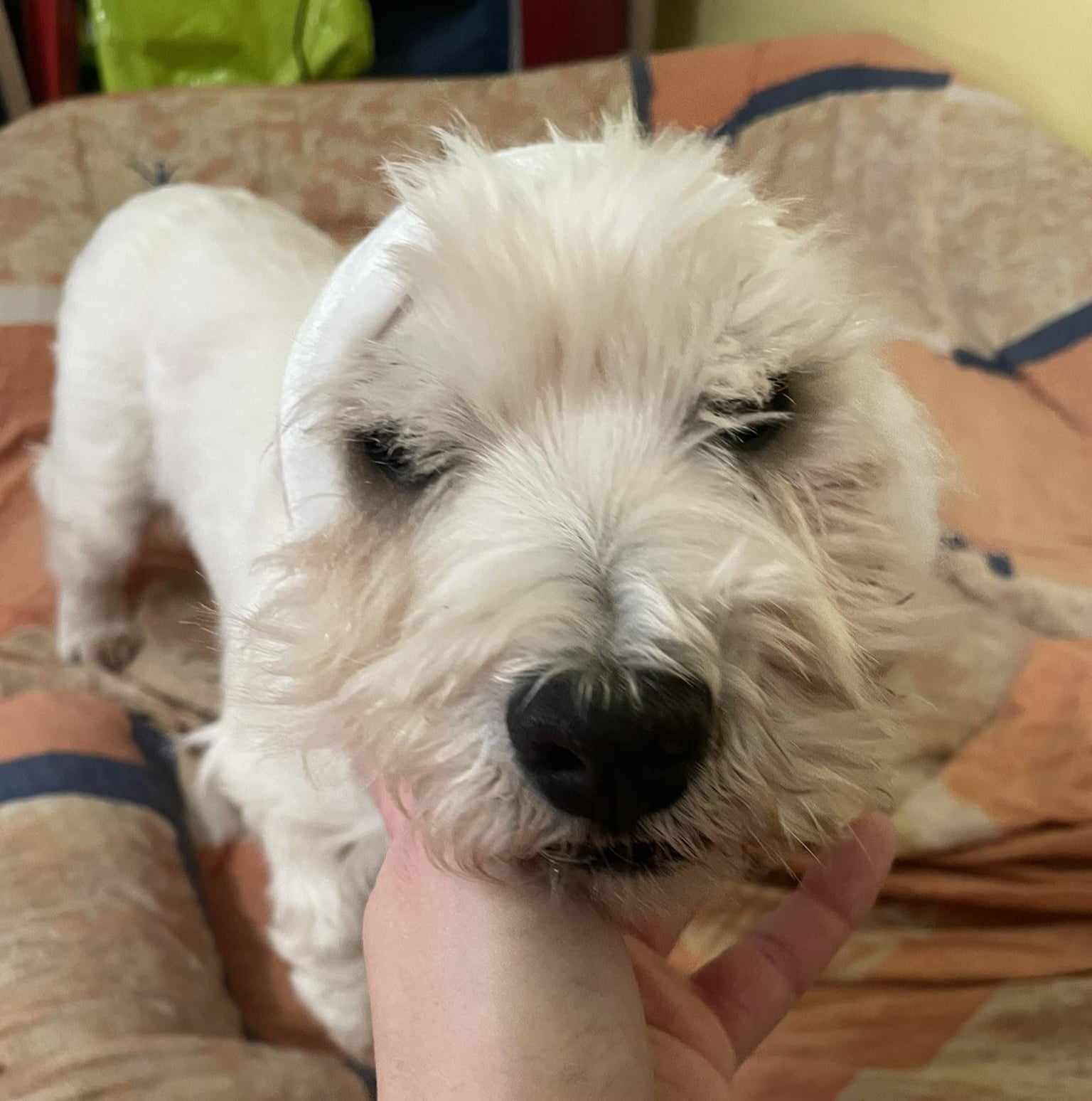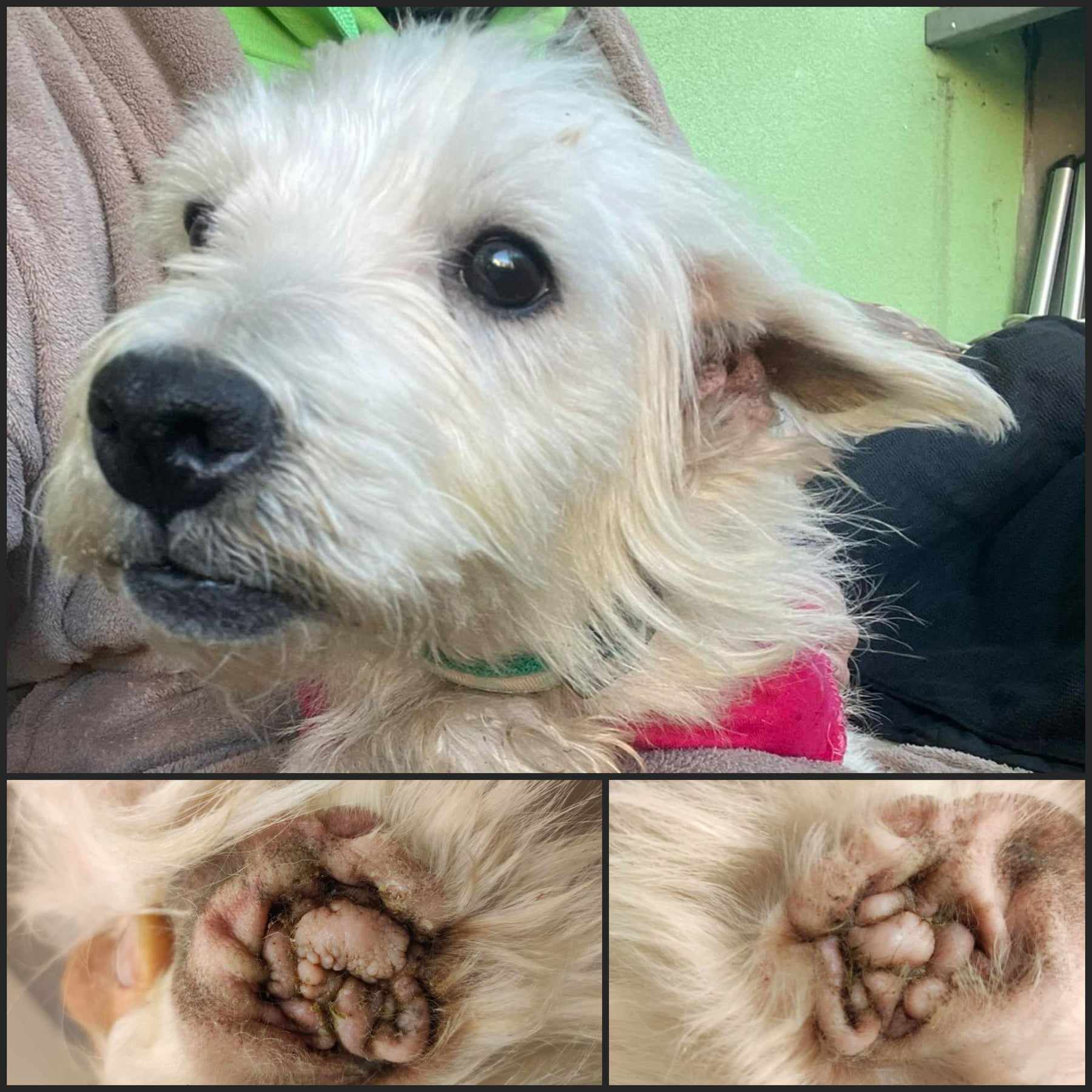 Nos hát, mindkét füle olyan szinten iszonyatos, hogy még mi is elrettentünk. A szaga alapján tudtuk, hogy szörnyű állapotok lehetnek odabent, ránézésre mint egy karfiolrózsa, aminek kezelése konzervatív úton nem lehetséges, csak sebészi megoldással. Panna egy újabb nagyon súlyos esetünk. Elhelyezését sikerült megoldanunk, ahol bár végtelenül békés és boldog kutyus képét mutatta, de azért mi tudtuk, hogy egy ilyen állapotú fül micsoda pokoli fájdalommal járhat. Megtörtént az operáció, mert a középfület érintő ilyen visszafordíthatatlan megbetegedéseknél szükség van a hallójárat eltávolítására, ami Csilla doktornéni elmondása alapján, jóval bonyolultabb volt az átlagosnál. A ki tudja mióta tartó krónikus gyulladás miatt, a középfül teljesen ki volt töltve gennyel, a csontos részek feloldódtak és nagy mennyiségű porcot is el kellett távolítani. Most 3 hét tölcsérviselés kezdődik és várhatóan jelentősen csökkennek Panna fájdalmai. Már most látszik, hogy imádja az embereket, bármilyen kutyával kijön, szobatiszta, tűri a fülpucolást és a sebkezeléseket. Nagyon jó kiskutya lesz belőle